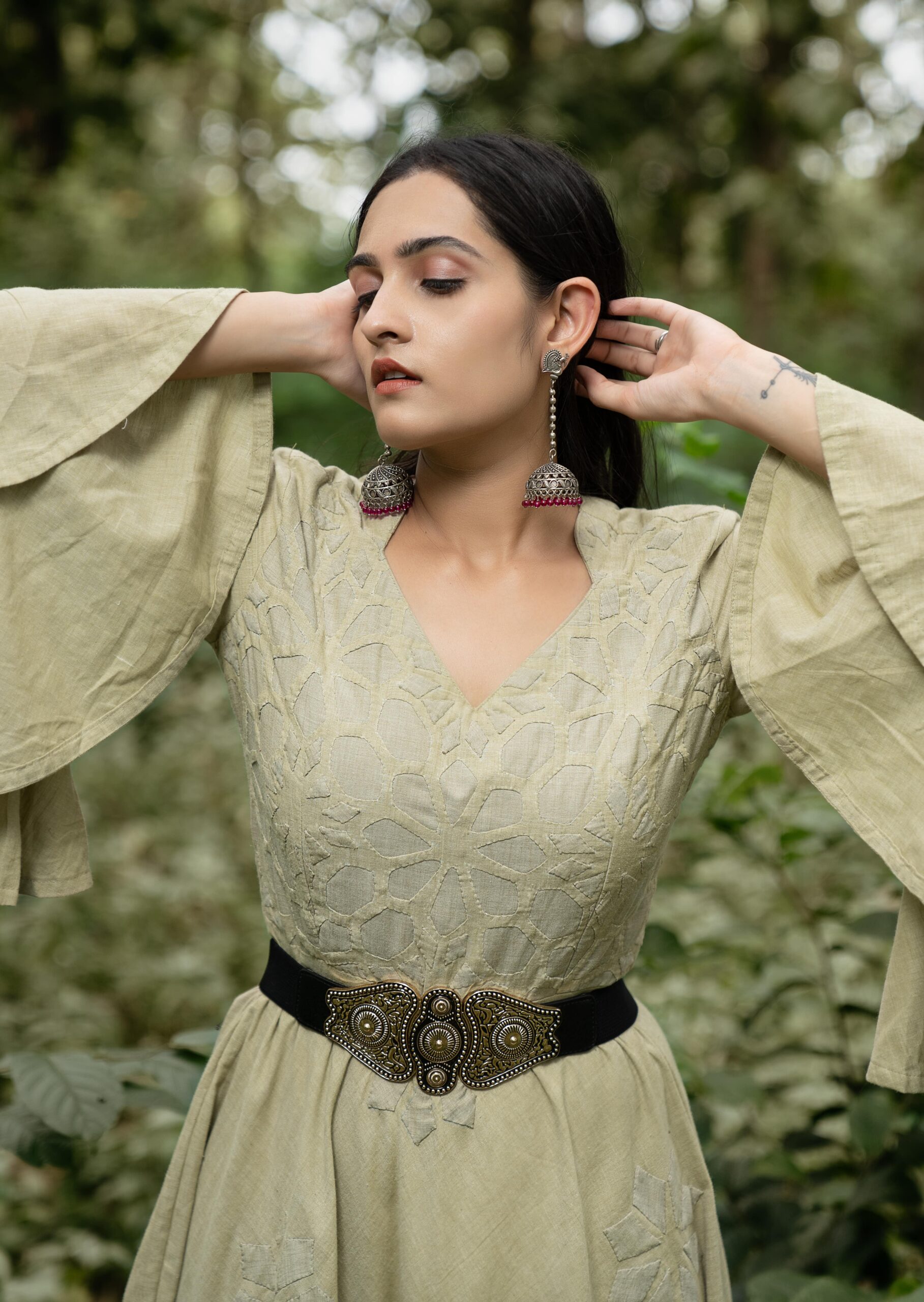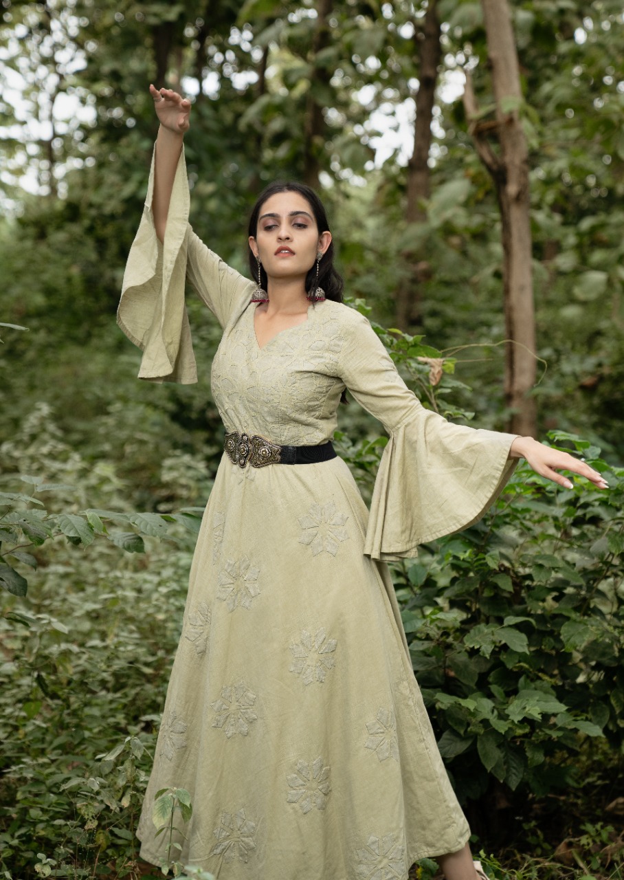 This elegant dress is made from sustainable khadi fabric and features a patchwork design made from different colors and patterns. The dress has a long, flowing skirt and a high neck with a self-tie closure. It is perfect for formal occasions.